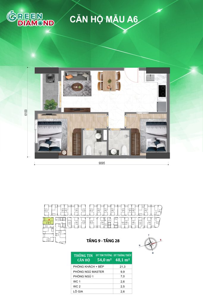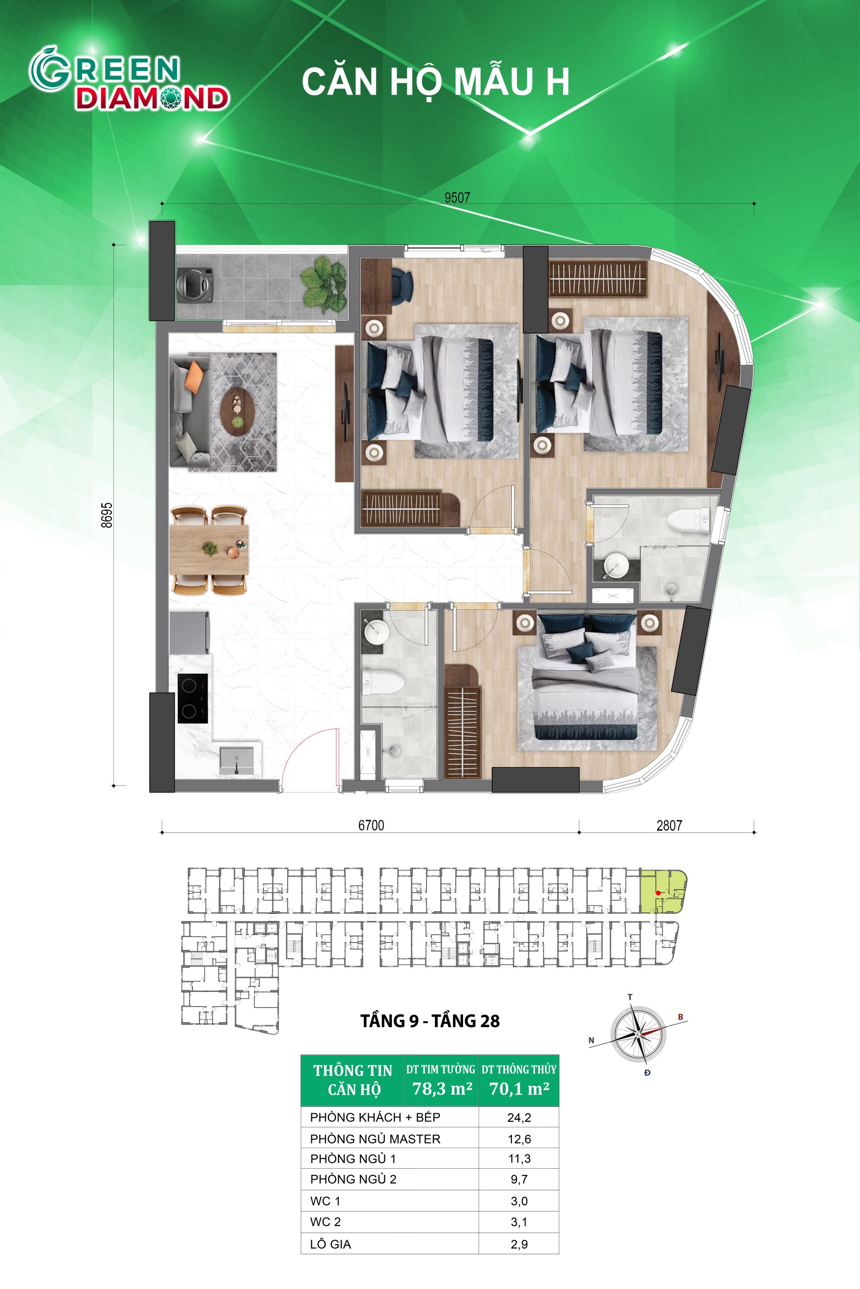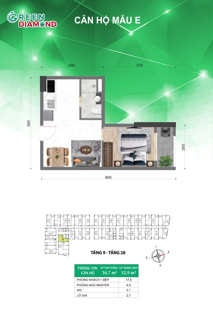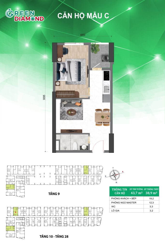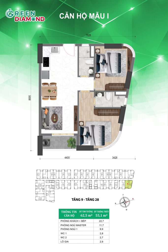 Tháp Green Diamond có thiết kế 2 tháp cao 27 tầng nổi và 2 hầm xe, cung cấp ra thị trường hơn 600 căn hộ, thiết kế 1 phòng ngủ – 3 phòng ngủ.