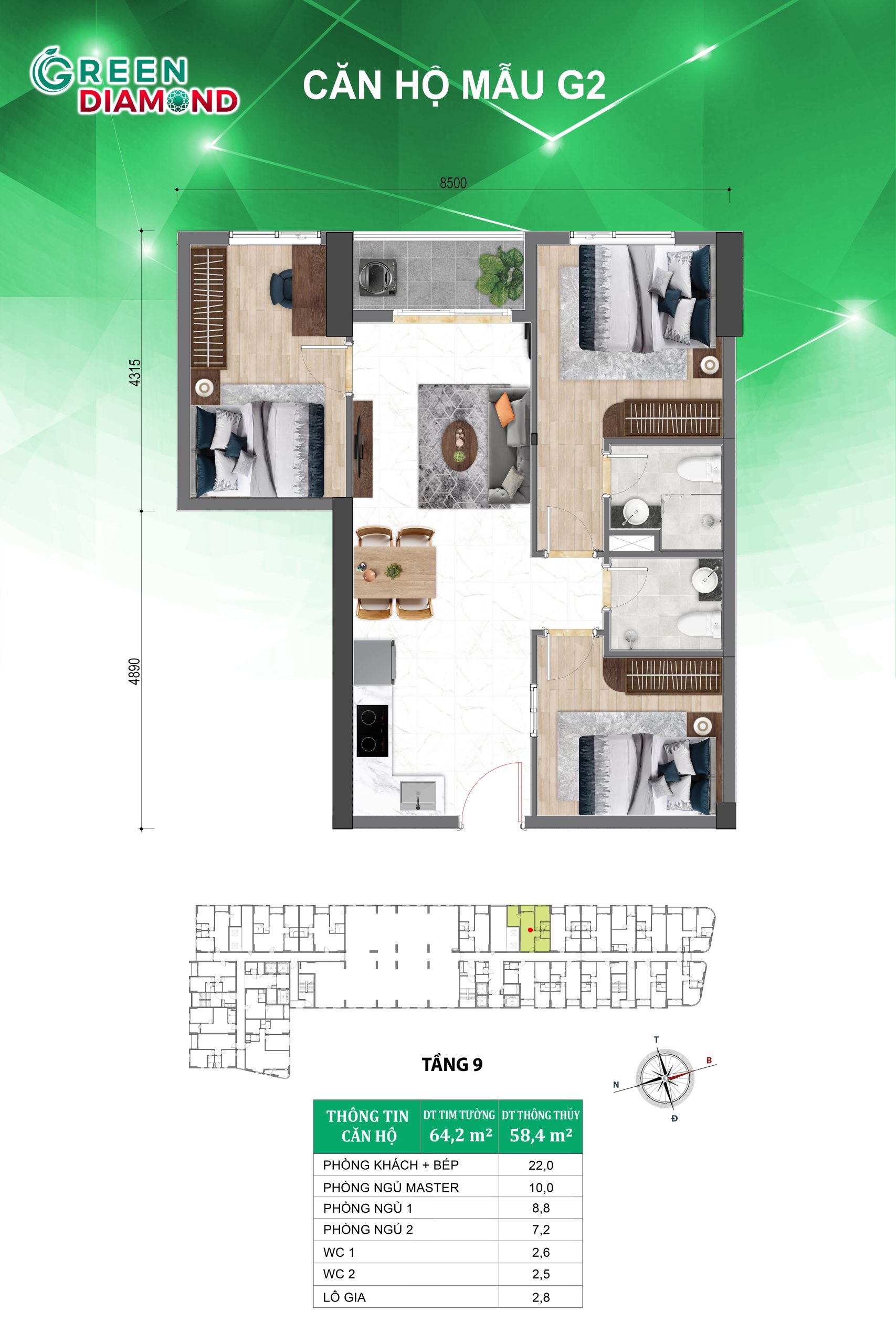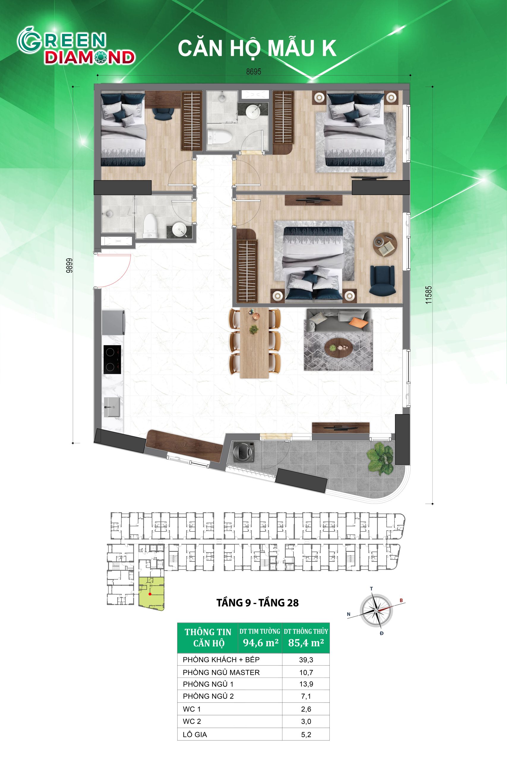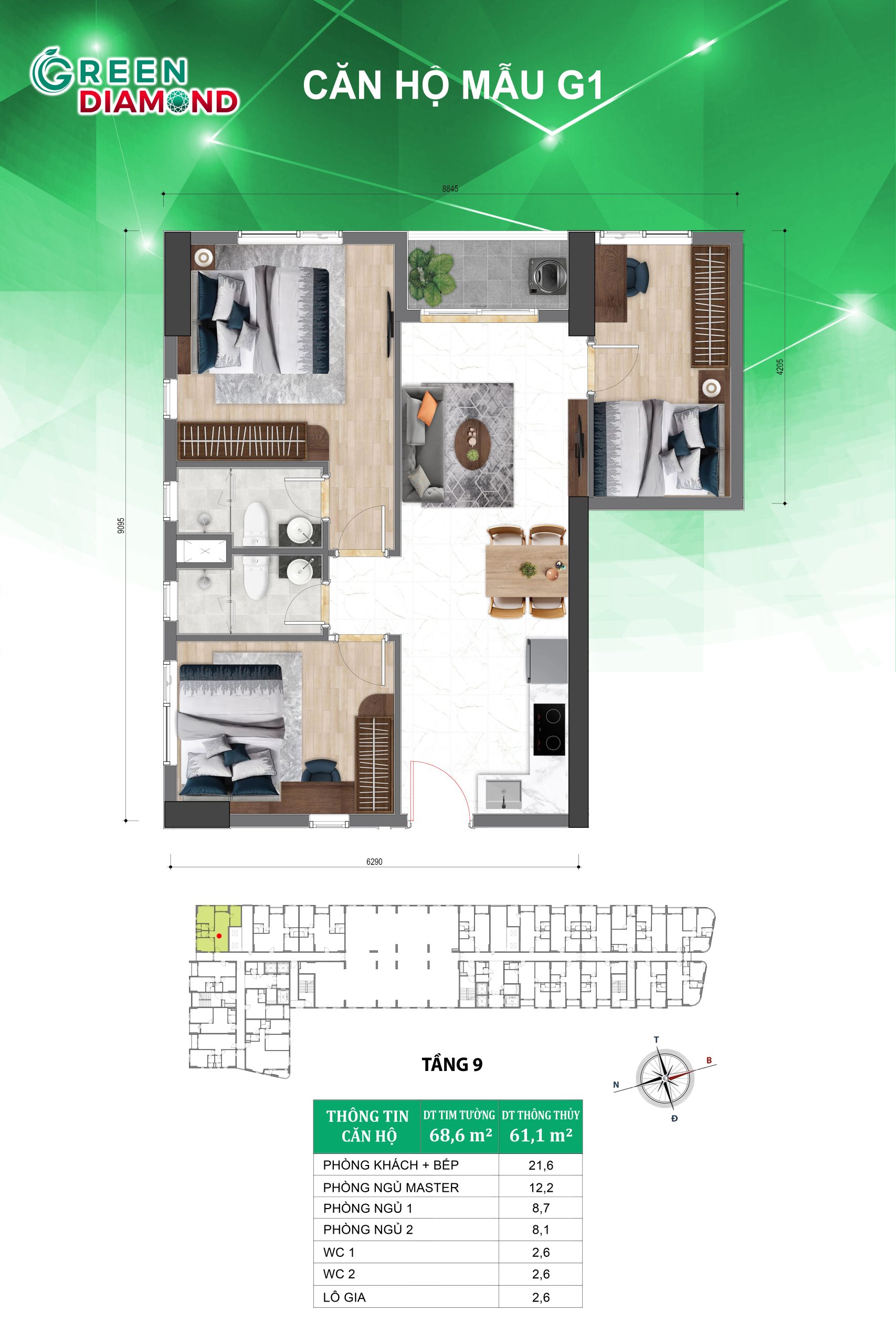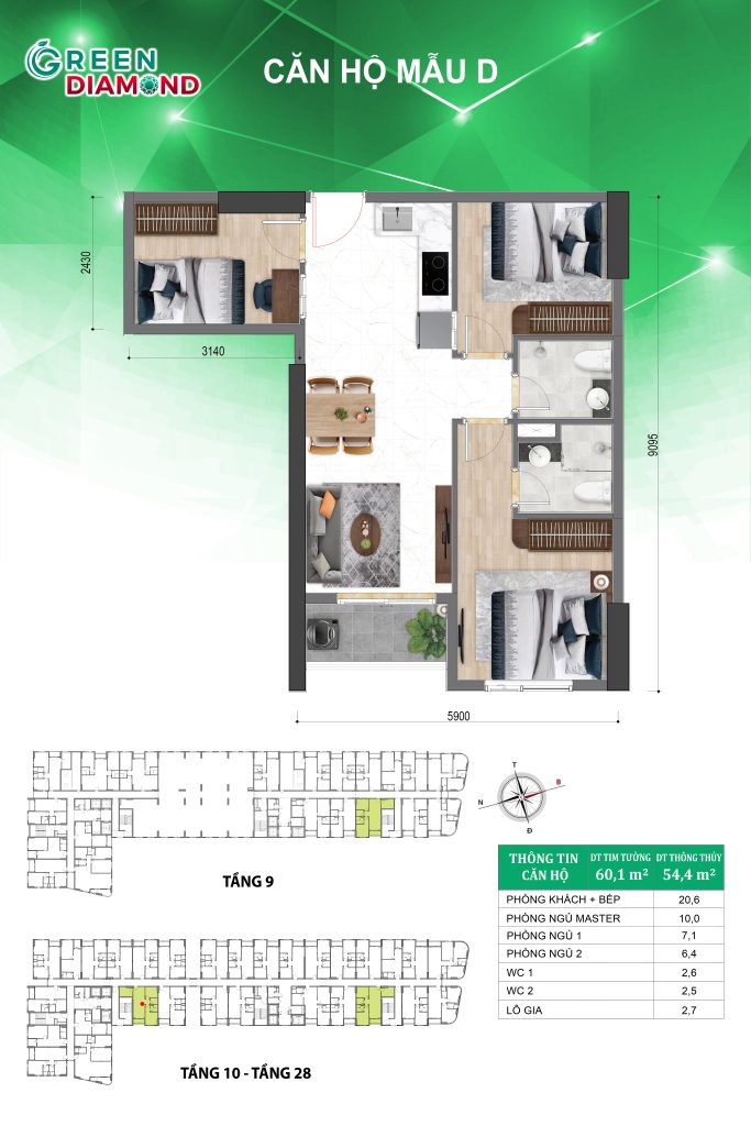 Tháp Green Diamond có thiết kế 2 tháp cao 27 tầng nổi và 2 hầm xe, cung cấp ra thị trường hơn 600 căn hộ, thiết kế 1 phòng ngủ – 3 phòng ngủ.