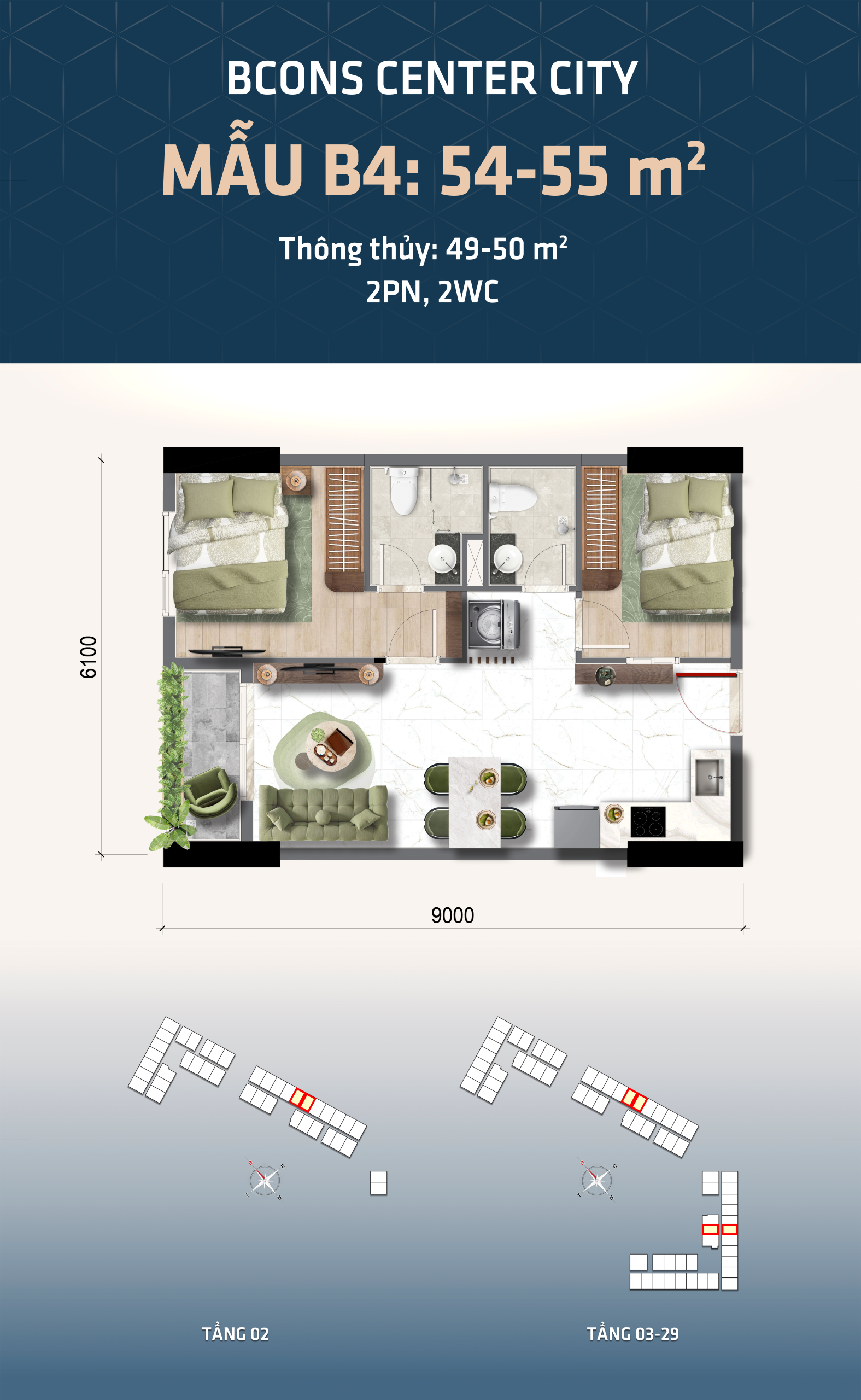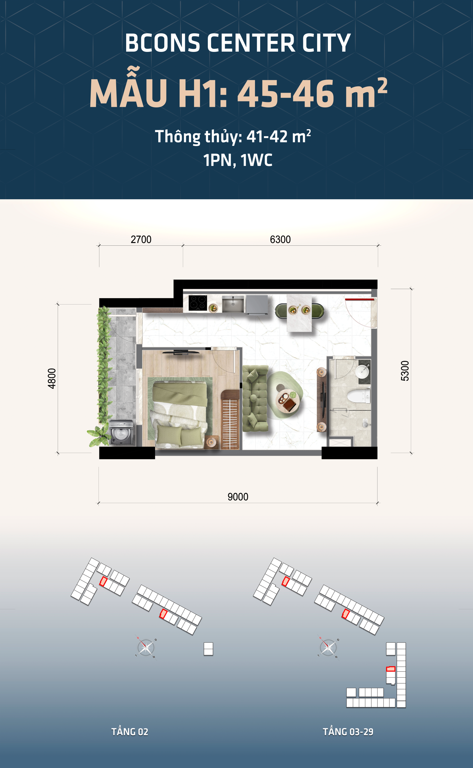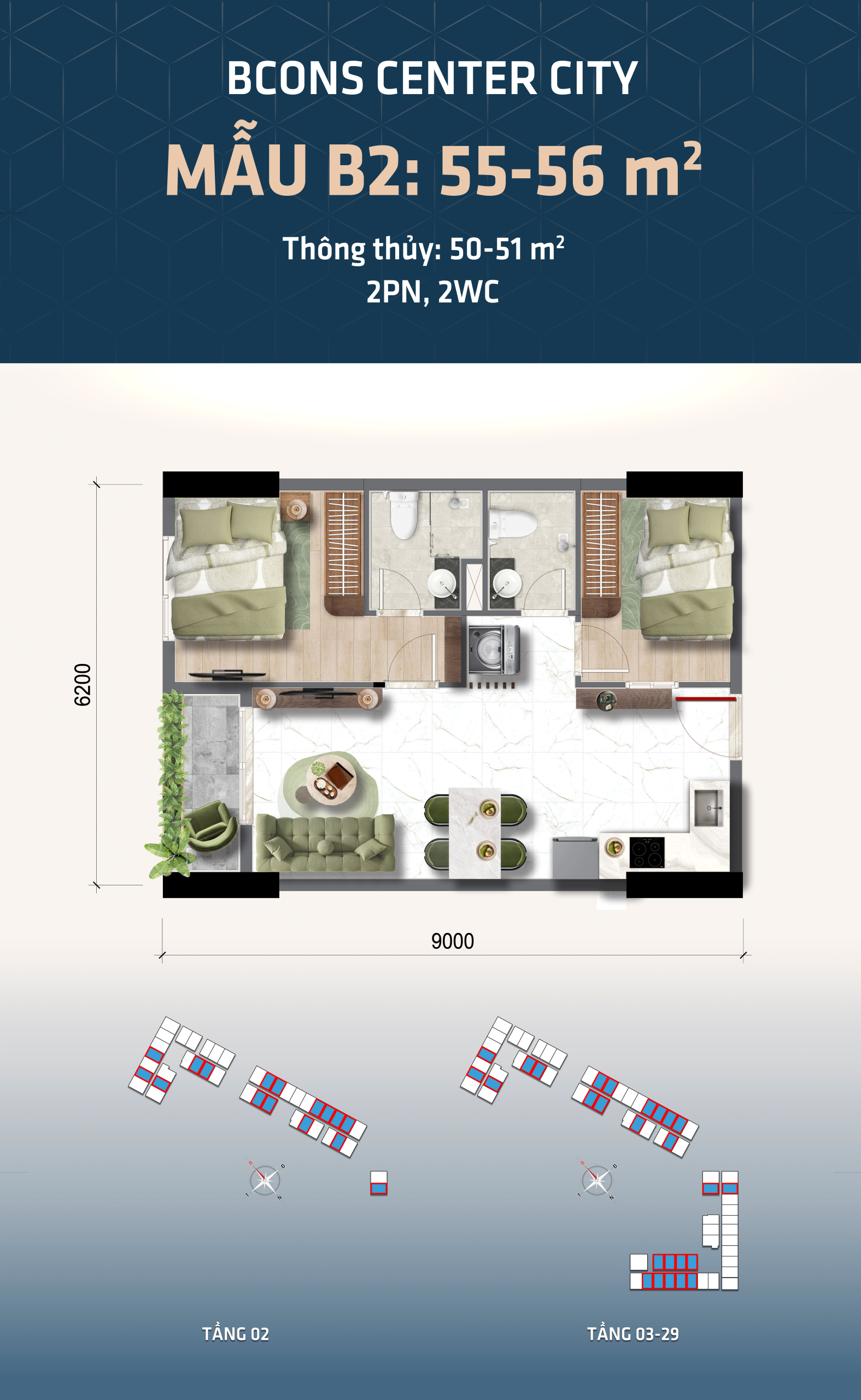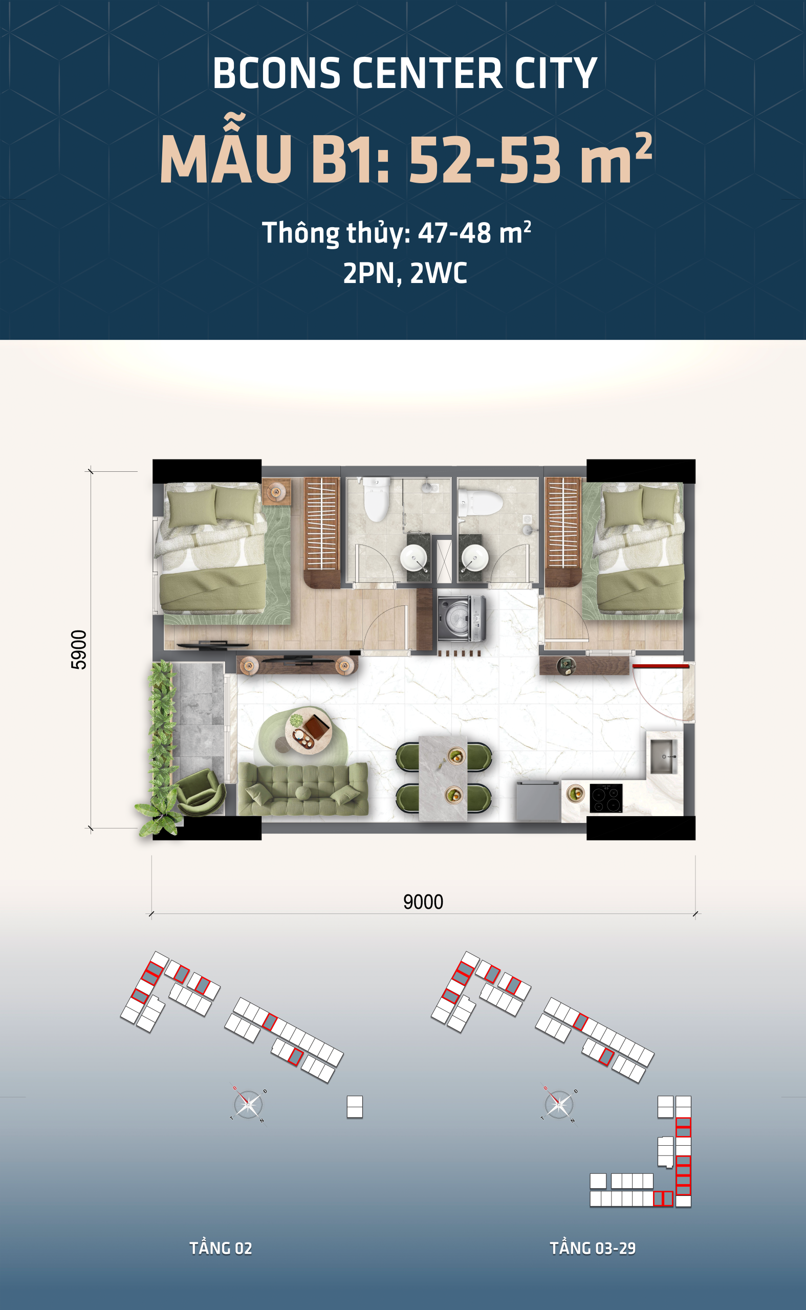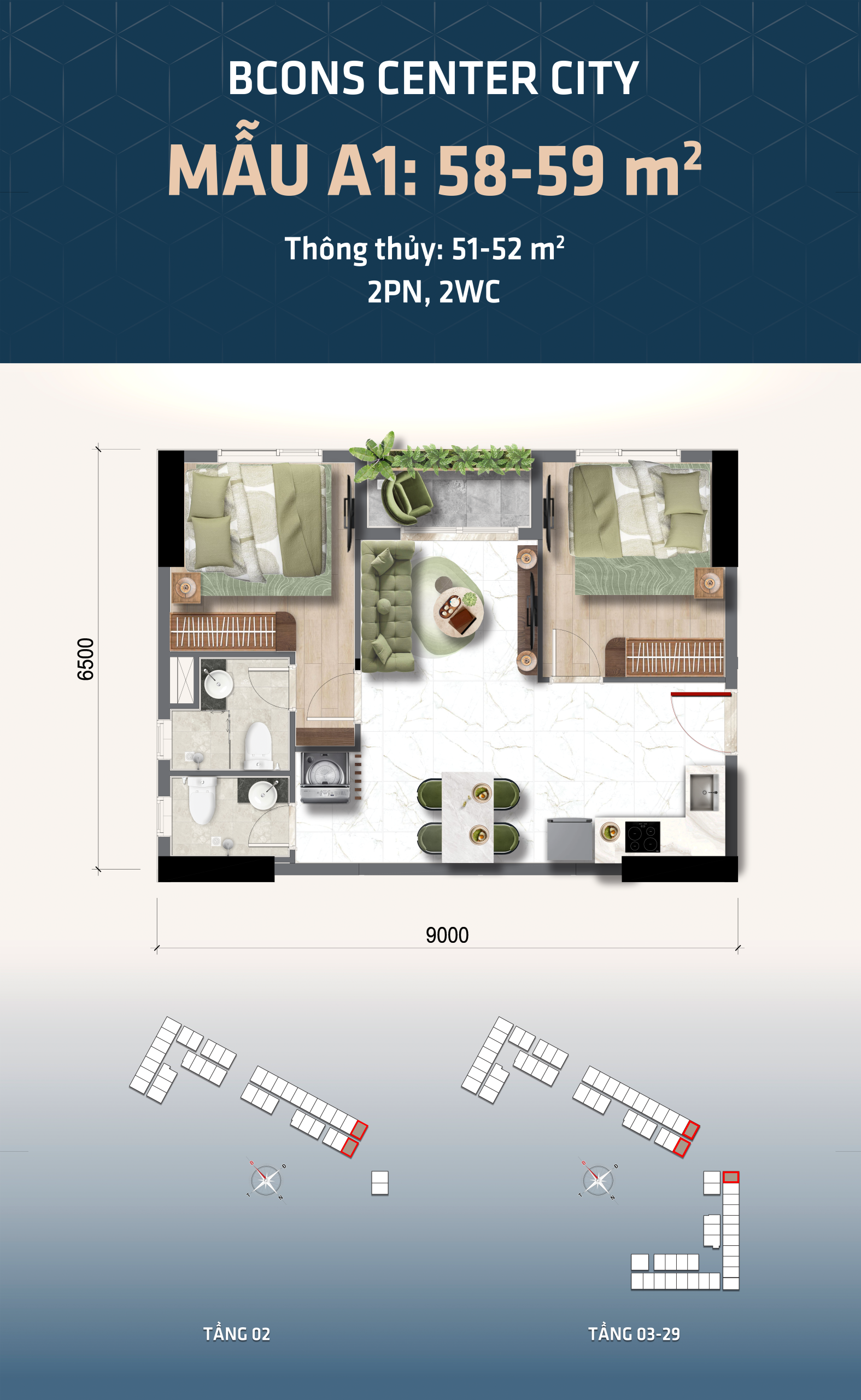 1PN: 43 – 45m2; 2PN: 52 – 559m2 3PN: 85m2 |