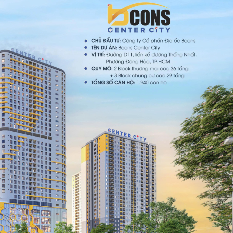 Bcons Center City có thiết kế 2 Block thương mại dịch vụ cao 36 tầng, 3 Block chung cư cao 26 tầng và 2 hầm xe, cung cấp ra thị trường hơn 1.940 căn hộ, thiết kế 1 phòng ngủ – 3 phòng ngủ.